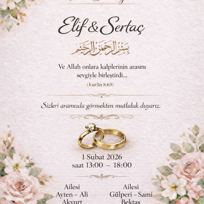 Resullü Mahallesi sakinlerinden, İzmit Gebze’de ikâmet eden Gülperi ve Sami oğlu Sertaç Bektaş; Sakarya Karasu nüfusuna kayıtlı Ayten ve Ali kızı Elif Akyurt ile 01 Şubat 2026 günü yapılacak törenle nişanlanıyorlar.